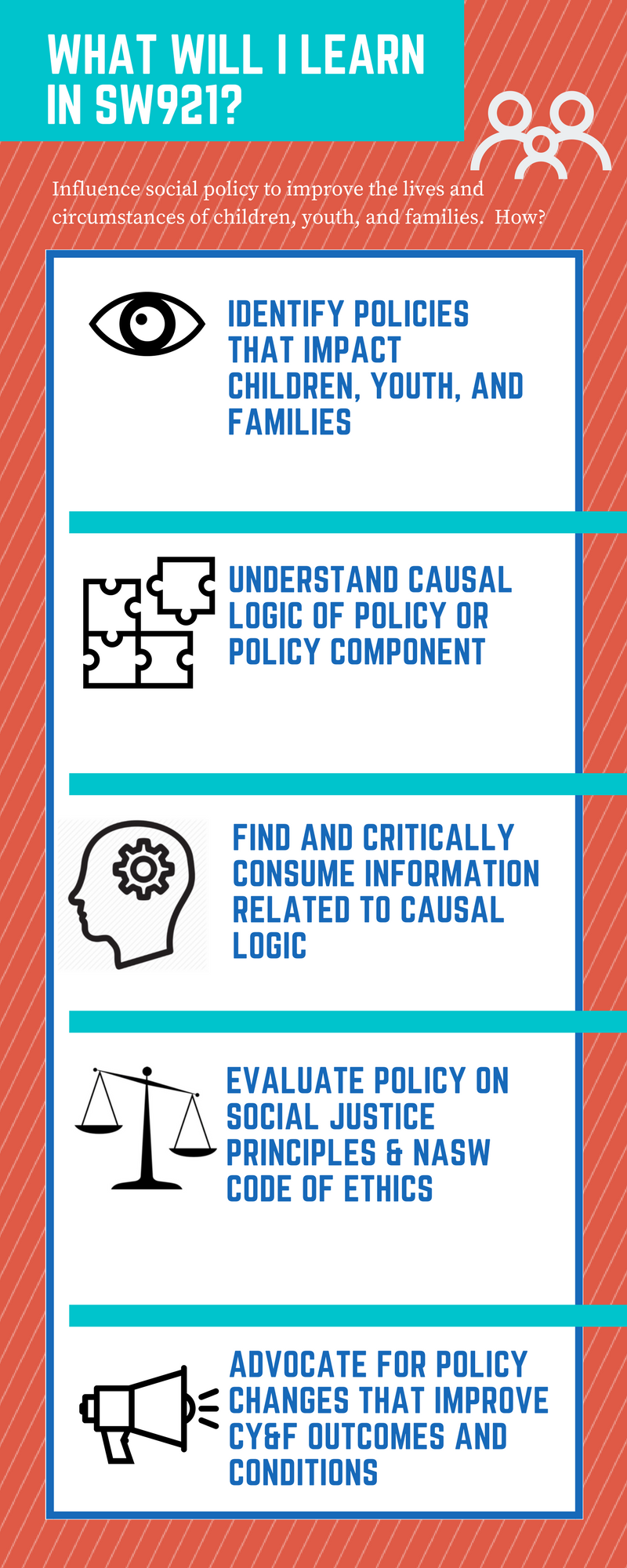 This course syllabus is intended for advanced standing (2nd year master's) students in Social Work. It focuses on child welfare policies and services, but also related policies and services that affect children, youth, and families. Also included is an infographic illustrating for students what they will learn in the course. I used "Canva" to create the infographic.