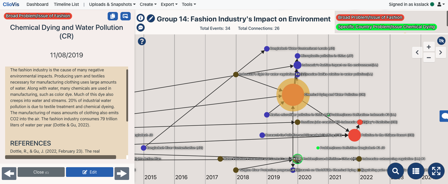 In Fall, 2022, I taught a course for 1st year students called "So, You Want to Change the World?". I relied on a web app called Cliovis for the major assignment, for which sections were staggered throughout the semester. Cliovis is a visual timeline developed by a history professor. The objective was to help students understand the roots and complexity of an issue that they chose to focus on. I sorted them into groups and while the group had to coordinate their contributions to the timeline, I graded everyone individually (which students appreciated, but also led to some students making less of an effort to collaborate.